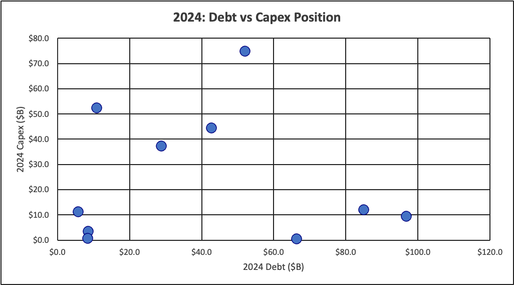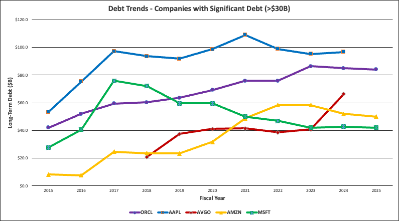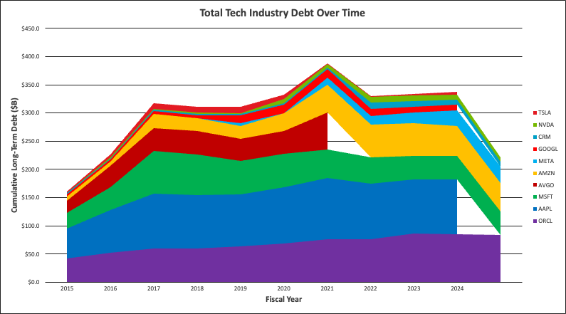 While the scale of capital expenditure is unprecedented, equally fascinating is how these companies are financing it. With total long-term debt exceeding $400 billion across the ten companies, three distinct approaches have emerged:
