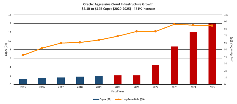 Oracle leads this category with $85 billion in long-term debt and a debt-to-Capex ratio of 7.08x—the highest among all companies analyzed. This aggressive leverage strategy reflects Oracle's push into cloud infrastructure (Oracle Cloud Infrastructure Gen2) and its need to compete with established players like AWS and Azure. The company has consistently used debt markets to fund both infrastructure buildout and strategic acquisitions.
