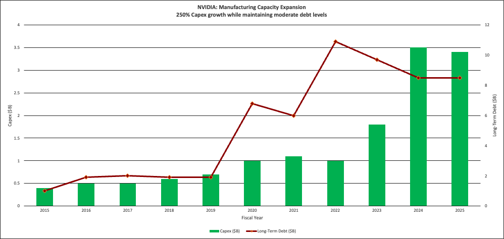 The company's Capex increased from $1.0 billion in 2020 to $3.5 billion in 2024—a 250% increase that, while impressive in percentage terms, remains far smaller in absolute dollars than the infrastructure companies. This reflects NVIDIA's asset-light manufacturing model: the company designs chips but outsources production to TSMC and other foundries.