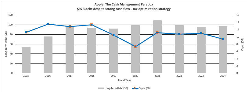 Apple, despite generating massive free cash flow, maintains approximately $97 billion in debt. However, this reflects a deliberate capital allocation strategy: borrowing at low rates to fund share buybacks and dividends while keeping overseas cash untaxed. Apple's debt-to-Capex ratio of 10.3x is misleading—the company isn't borrowing to fund operations but rather to optimize its capital structure.